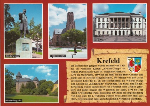 Krefeld am Niederrhein gelegen, wurde erstmals von Tacitus als römisches Kastell "Krefeld-Gellep" erwähnt. Durch Kaiser Karl IV. erhielt der Marktort 1373 die Stadtrechte. 1600 fiel die Stadt an das Haus Oranien und damit galt in Krefeld Religionsfreiheit. Die Brüder von der Leyen eröffneten Ende des 17. Jh. eine Seidenfirma, die Weltruf erlangt und Krefeld als "Seidenstadt" begründete. Die Samt- und Seidenherstellung wurde insbesondere von Friedrich dem Großen gefördert und damit begann das Wachstum der Stadt. 1794 bis 1815 stand Krefeld unter franz. Besatzung. 1901 fand die Eingemeindung von Linn statt. Im 2. Weltkrieg wurden zwei Drittel der Stadt zer- stört. Krefeld gehört heute zum Bundesland Nordrhein-Westfalen. |